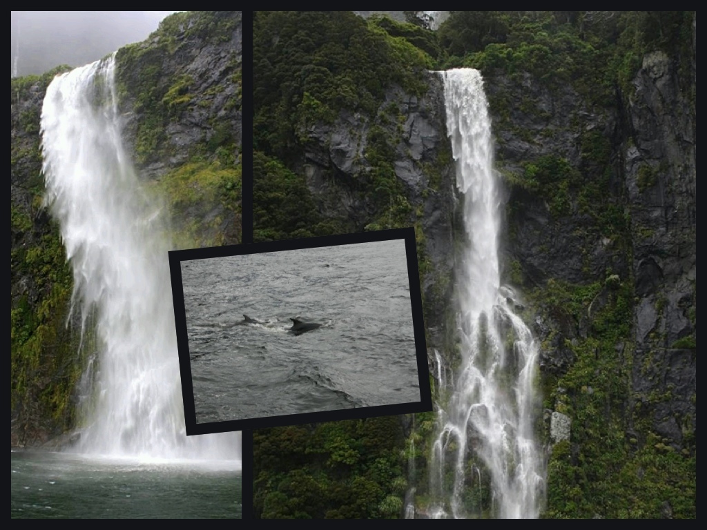 Tous ces tons de gris bleu avec ce brouillard qui se dégage peu à peu pour nous laisser voir le sommet des montagnes. La pluie cesse également vers la fin de notre parcours. Il nous a été possible d’observer les dauphins et quelques Southern Crested Penguin. Même notre premier kiwi est sorti du bois quelques instants. Notre moment le plus fort demeure cette entrée dans la mer de Tasman à la sortie du fjord dans des vagues de … hum… au moins 6 à 8 pieds!! Jess et moi étions les seules braves à l’extérieur, s’amusant de se faire arroser à la proue par l’eau salée projetée par la coque du bateau fendant les vagues. Voyez les quelques photos prises par Jess qui parlent d’elles-mêmes. La route du Milford Sound à elle seule vaut les 4 heures aller-retour de Te Anau.