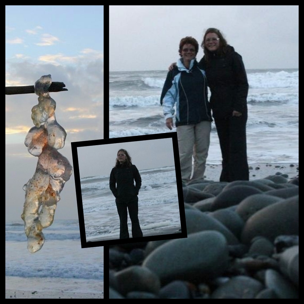Et puis toujours sous ce temps brumeux et mouillasseux, nous arrivons à notre destination du jour, Greymouth, et s’installons pour la nuit à quelques 100 mètres de la mer de Tasmanie, toujours aussi rugissante et magnifique. Le ciel se dégage un peu, suffisament pour nous permettre d’assister à un joli coucher de soleil et de rechercher quelques belles pierres.