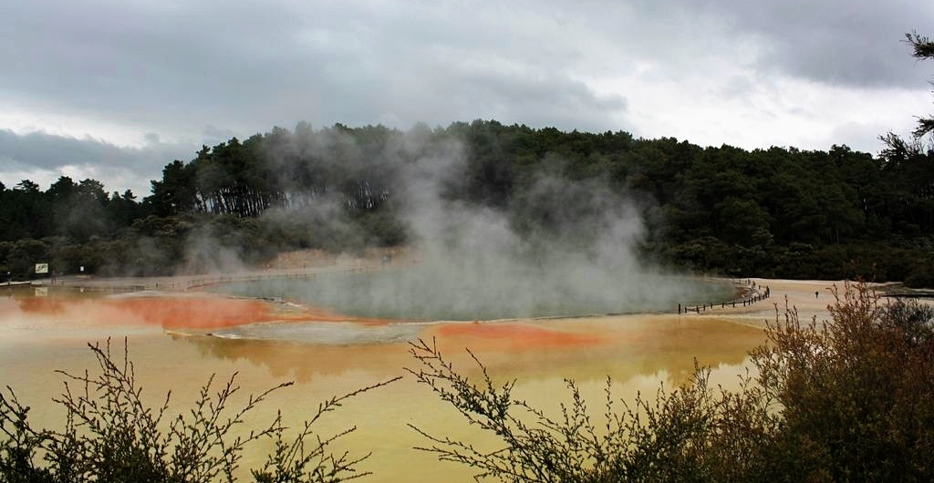 Près de 9h, nous arrivons à Wai-O-Tapu Thermal Wonderland (situé à 29km de Rotorua). Une halte s’impose à cet incontournable « pays des merveilles ». Nulle part ailleurs nous ne verrons une telle variété de lacs, cavités, bains de boue bouillonnante et terrasses de silice aux couleurs de l’arc-en-ciel. La réserve est mondialement réputée pour sa « Champagne pool » qui fait souvent la couverture des guides et magazines touristiques.