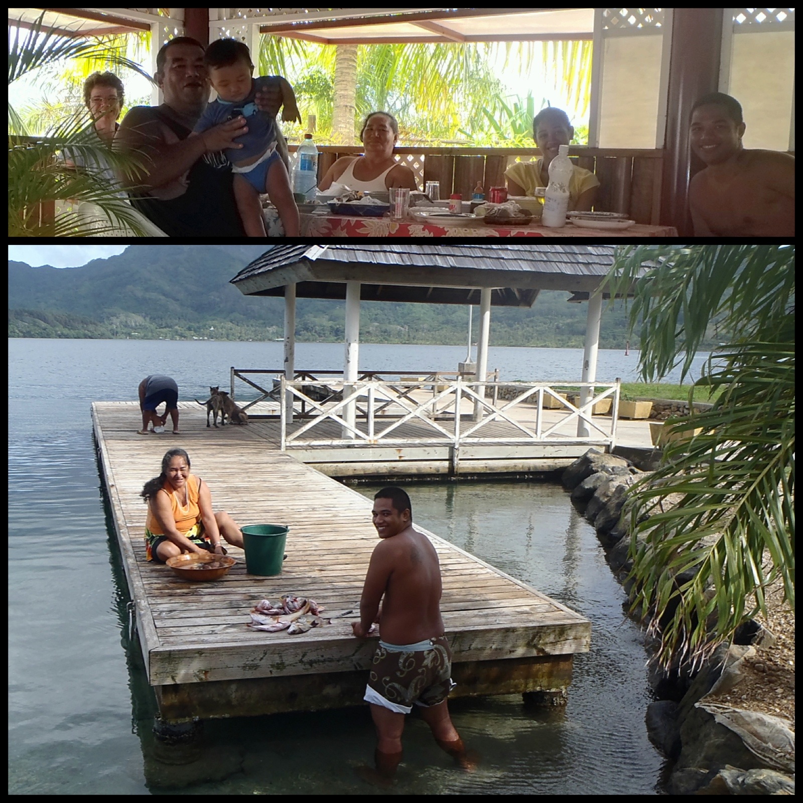 En ce dimanche, je suis conviée au dîner familial tahitien avec toute la famille. Et lorsque que je réponds: ah, oui avec grand plaisir, Tutea ajoute la condition que je dois manger également comme eux, soit entièrement avec les doigts!! Pas de problème! Au menu: poulet aux épinards avec lait de coco, cochon aux choux, poisson cru au lait de coco, poe (dessert à la papaye), soit un repas complet tahitien divinement bon, bière tahitienne et vin blanc. J’ai préféré la bière qui est TRÈS bonne. Et ça aide pour vous entrer dans la bouche les cinq doigts qui tiennent la nourriture! :-). Blague à part, il est vrai que la nourriture goûte meilleure. À la fin du repas, ma serviette de table en tissu est dans un sale état, alors que celles de mes hôtes sont impeccables… J’ai donc repris mes ustensiles au souper. Cela a semblé peiner Lolita un peu, mais je vais repratiquer avant mon départ.