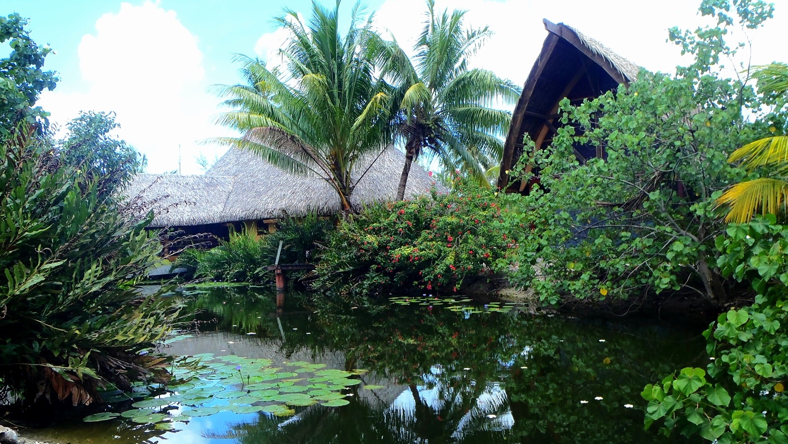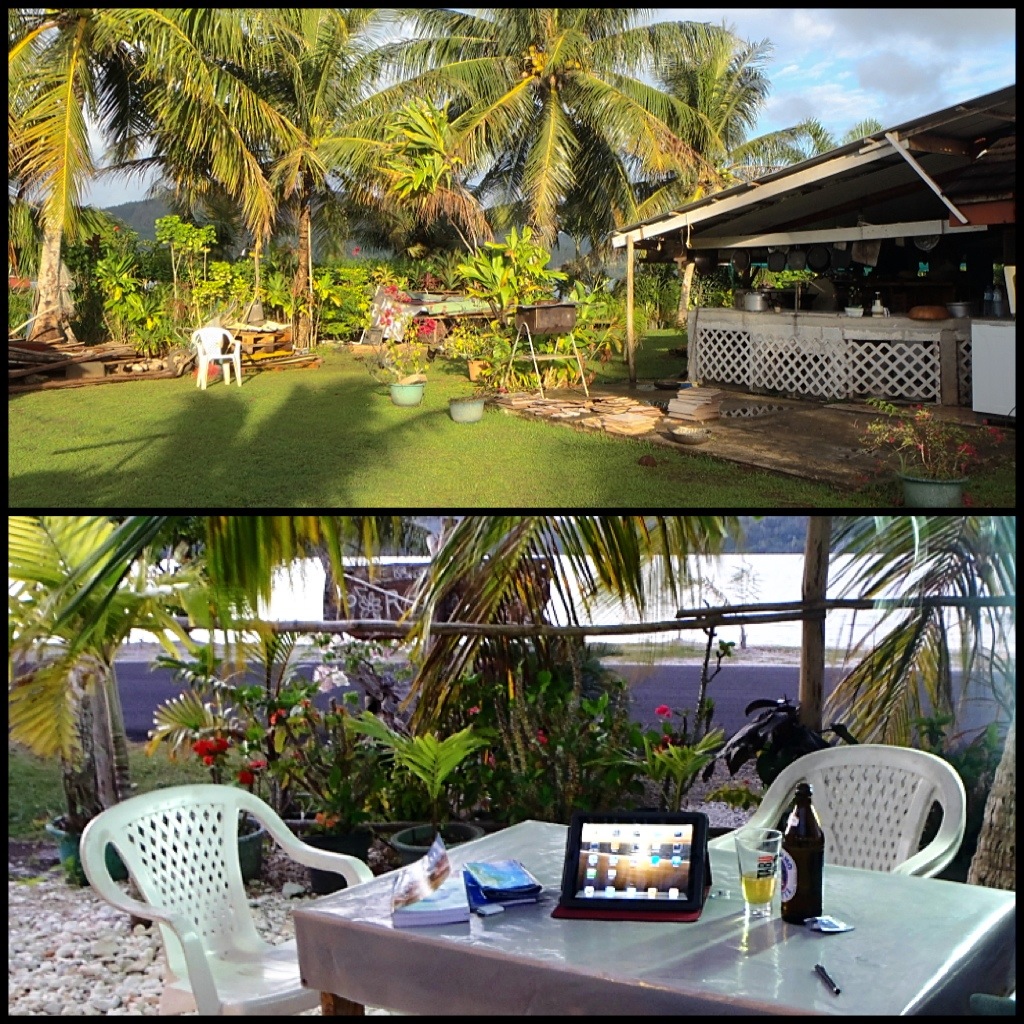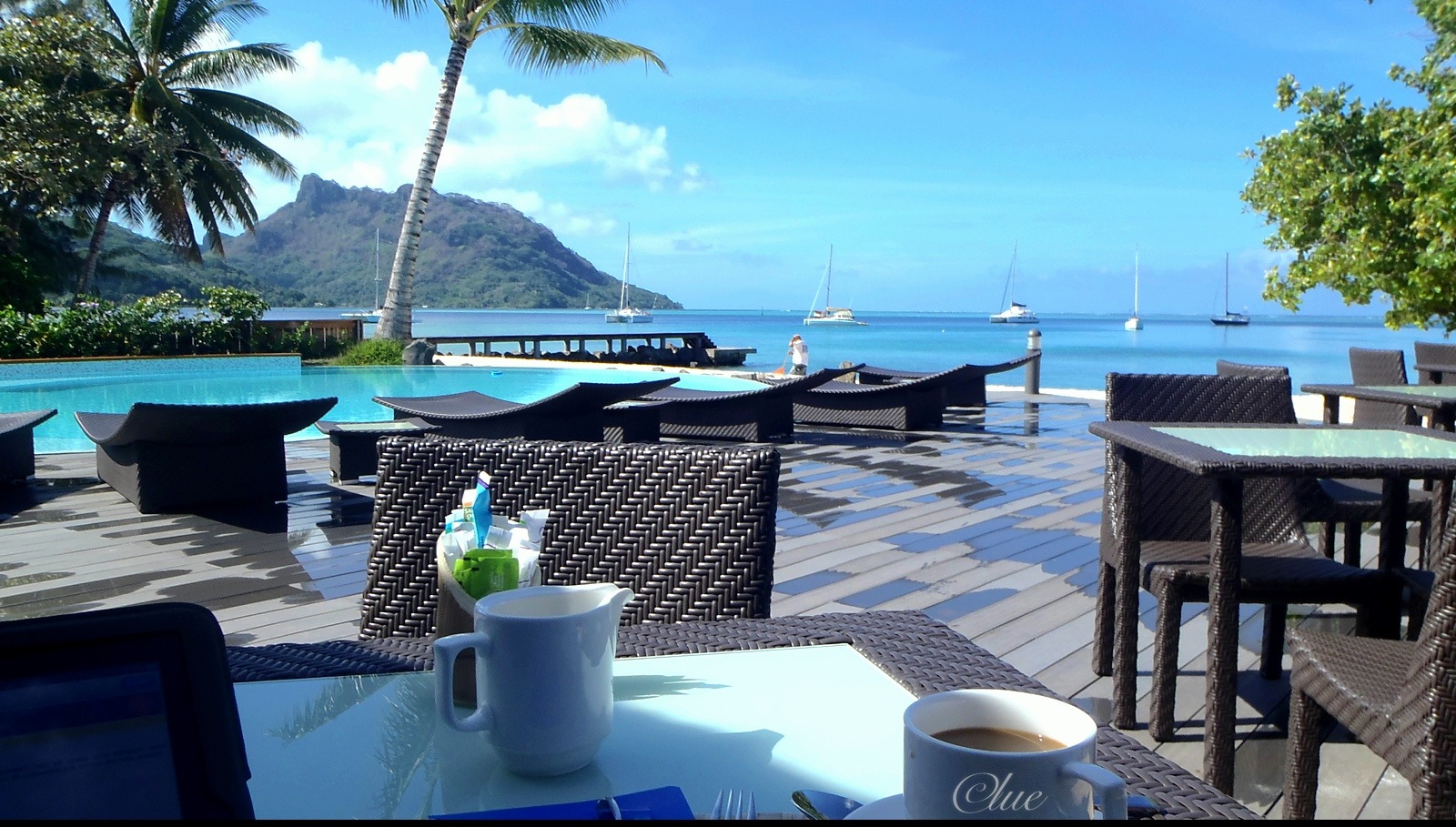 8h – Me voilà en possession de ma petite GM et je dois trouver un endroit où obtenir un signal WiFi car j’ai très hâte de publier mes textes. Je me retrouve donc au Pearl TreeHouse, tout nouveau complexe hôtelier à Fare détenu par le propriétaire de la ferme perlière, il est américain vivant en Polynésie depuis des années et marié à une Polynésienne. Regardez la photo ci-dessous… Pas facile d’y passer deux heures à travailler sur ce blogue… et sous cette chaleur!!! Soupir…