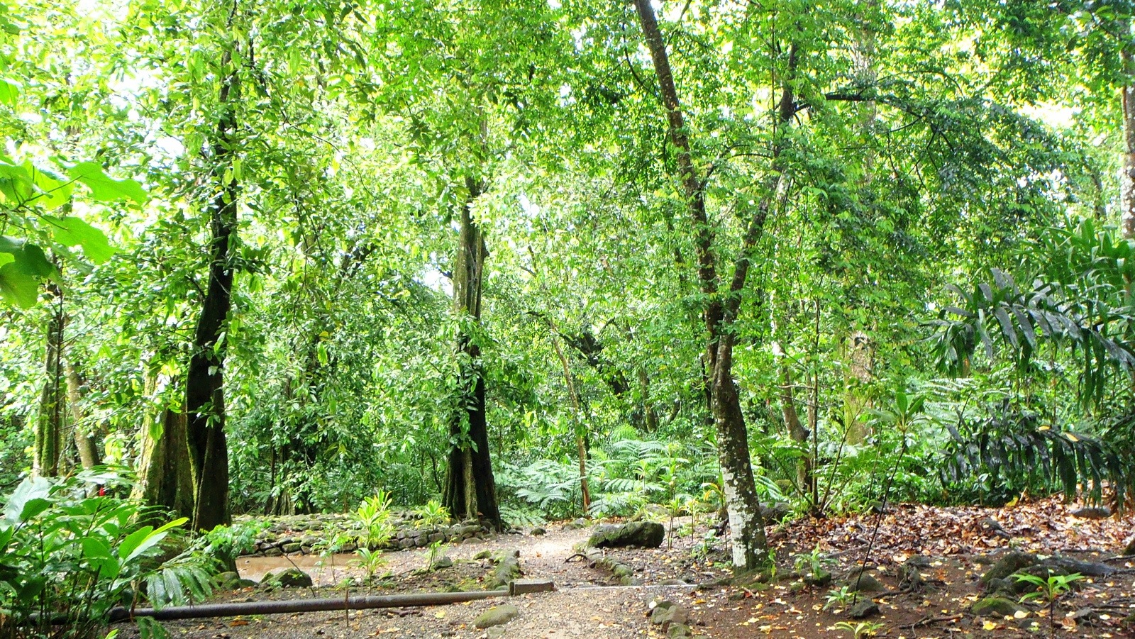 La forêt tropicale est luxuriante, odorante à s’ennivrer, toute luisante encore de cette pluie qui s’accroche aux feuilles, aux branches. Même les poules sauvages ont l’air de… poules mouillées! Le site se compose d’un ensemble complet de vestiges, partiellement restaurés, comprenant des marae familiaux et communautaires (‘marae’ se prononce comme ‘marais’ – lieu de culte, un sanctuaire, entouré de tapu – interdit, sacré), des lieux de cultes, des habitations et des plates-formes de tir à l’arc. Je suis complètement seule dans la forêt… Je marche d’un site à l’autre pendant près d’une heure.