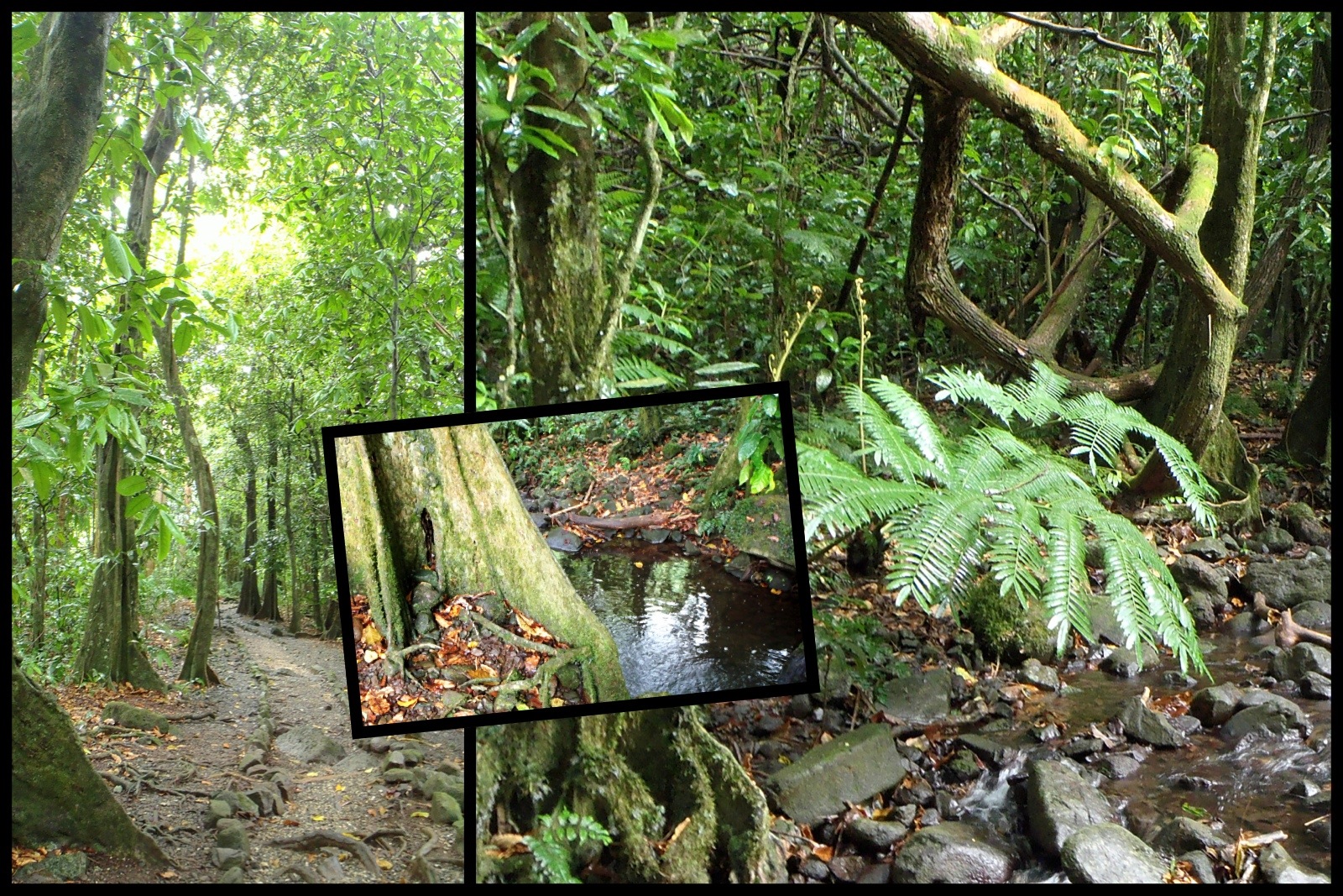 Je m’asperge avec soin de chasse-moustique, car il semblerait que les insectes auraient établi leur quartier général à cet endroit… ;-). Fait rare, on visite ce site en suivant un sentier balisé. Je marche prudemment, n’ayant pas mes chaussures de sentier et ce dernier est particulièrement glissant suite à la pluie, la mousse et les pierres lisses recouvrant le sol.