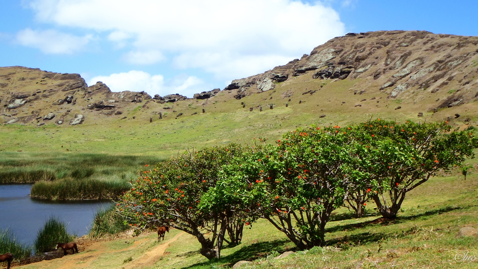 J’arrête à tout moment pour tout voir, j’emprunte toutes les pistes. Les chevaux sont à l’Île de Pâques, ce que les moutons sont à la Nouvelle-Zélande et l’Islande: ils sont nombreux aux abords des routes et sur les pistes. Plusieurs n’appartiennent à personne. On ne paie pas pour un cheval ici, on en veut pas même en cadeau, on ne sait quoi en faire. Une herbe, le lupin, est toxique pour les chevaux. Faute d’avoir rien d’autre à manger, le cheval se laisse tenter… mourir de faim ou lentement – des semaines ou des mois – par empoisonnement. (Jess, tu dois avoir le coeur brisé, mais ceux sur la photo ne sont pas morts, ils font dodo. :-))