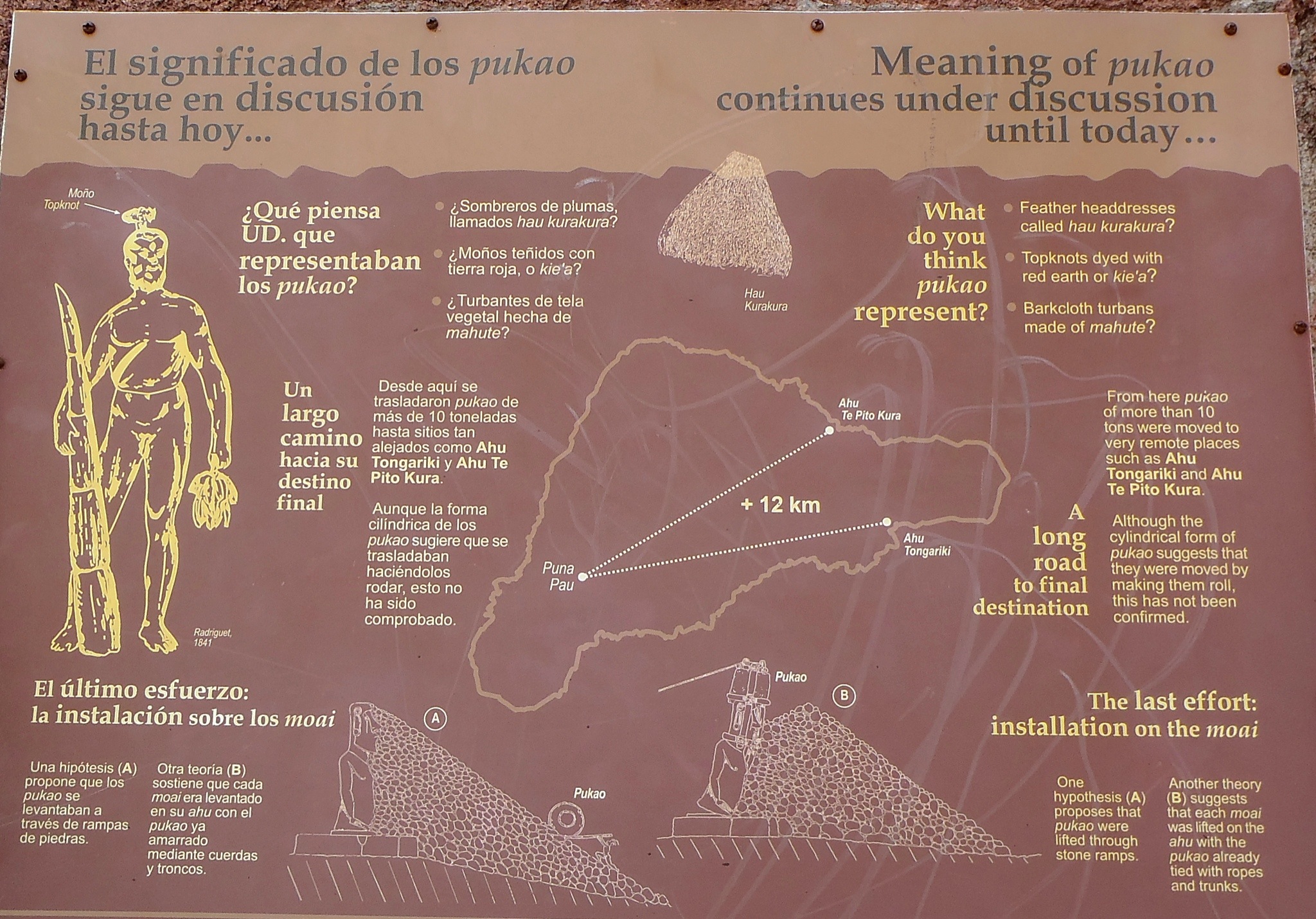 Je vous invite à agrandir et regarder le plan ci-dessous démontrant deux hypothèses sur la façon dont le moai était mis de debout et qu’on lui installait sa toque. Demain, j’irai à cette carrière de tuf rouge où étaient taillées les coiffes pour ensuite être déplacées à douze kilomètres de la carrière.