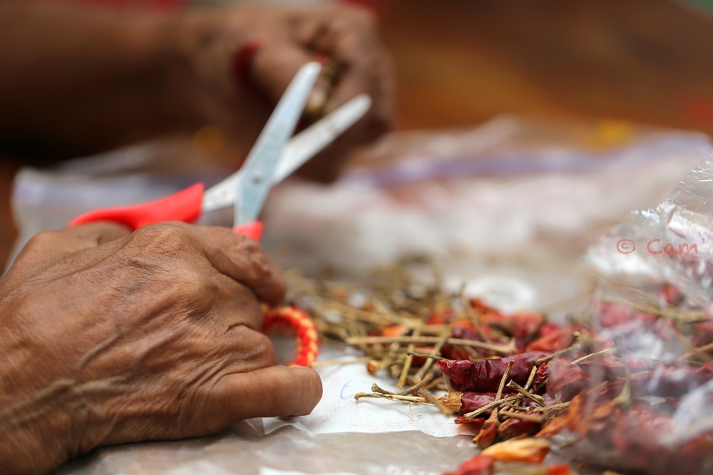 Cam, photographe, arrive et me chipe ma caméra pour faire quelques photos de Mamie, la mère de Manel. Elle est toujours souriante et adore se faire photographier. Elle coupera ces piments forts toute la matinée.