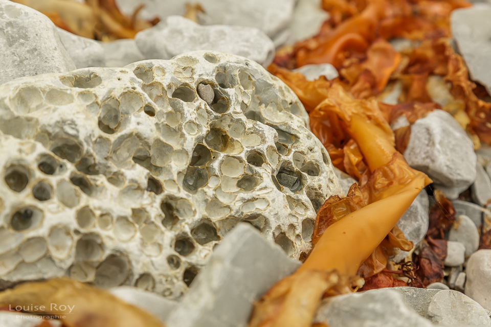 Ça sent bon et fort le varech. La plage rocailleuse est recouverte de larges bandes d’algues flamboyantes. La mer nous étale une palette de teintes turquoises qui me rappellent quelques endroits de la Polynésie. L’endroit est tout simplement magique, féérique! Chacun y déambule en solo à la recherche de trésors.