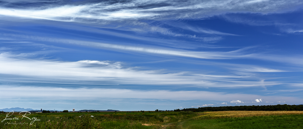Ma faiblesse pour les nuages est ébranlée à la vue de ces magnifiques cirrus et cirrostratus! Les têtes folles de l’orge se balancent au rythme du vent, dansant et célébrant la beauté du ciel.