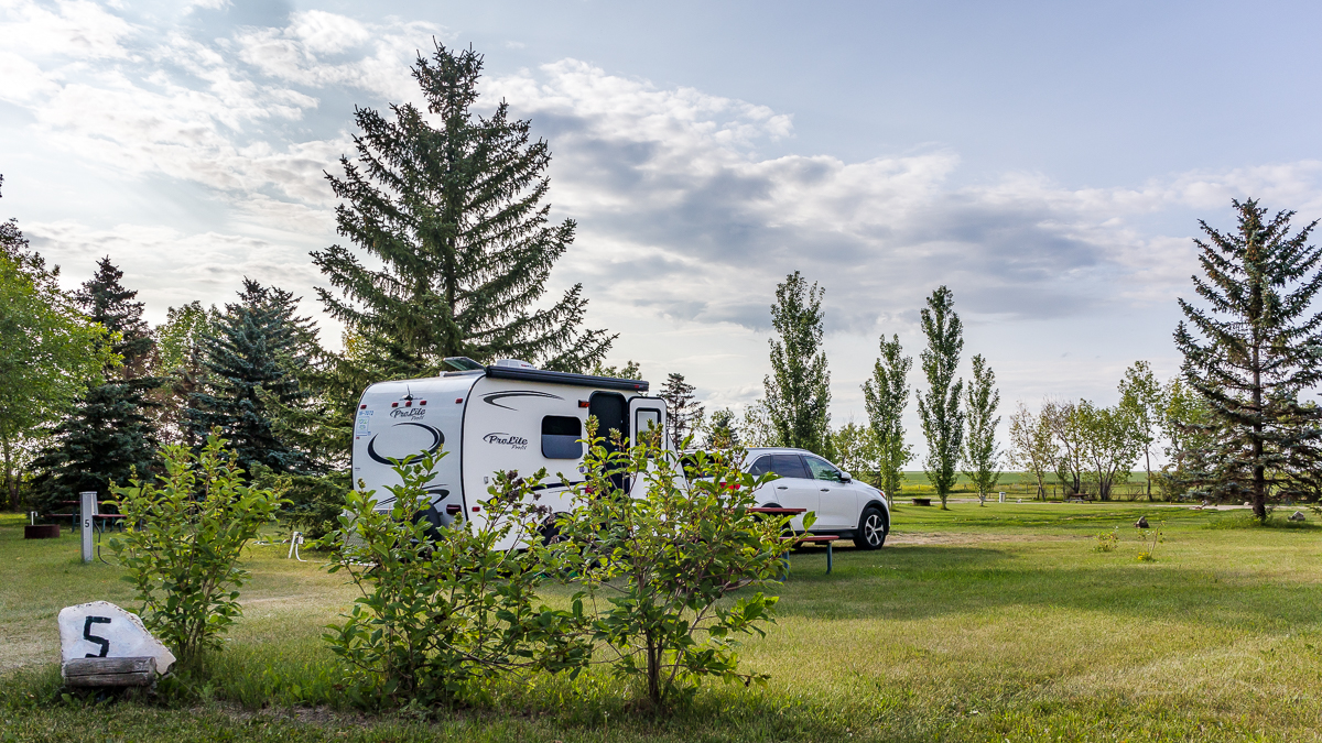 À moins de 60 kilomètres de Saskatoon, on s’installe au Painted Rock Campground de Colonsay.  C’est l’endroit le plus calme de la semaine. Que des chants d’oiseaux! 🙂  Après qu’elle m’ait accompagnée jusqu’à mon lot avec sa voiturette du golf, je demande à la dame de l’office s’il y a du wifi.  – Oui, mais on doit se rendre à l’office car le signal n’est pas fort. Je lui demande tout de même le mot de passe, lui signalant que je suis dotée d’une pantenne puissante.  Et yes-madame, j’obtiens un excellent signal en installant mon antenne sur la fenêtre extérieure.