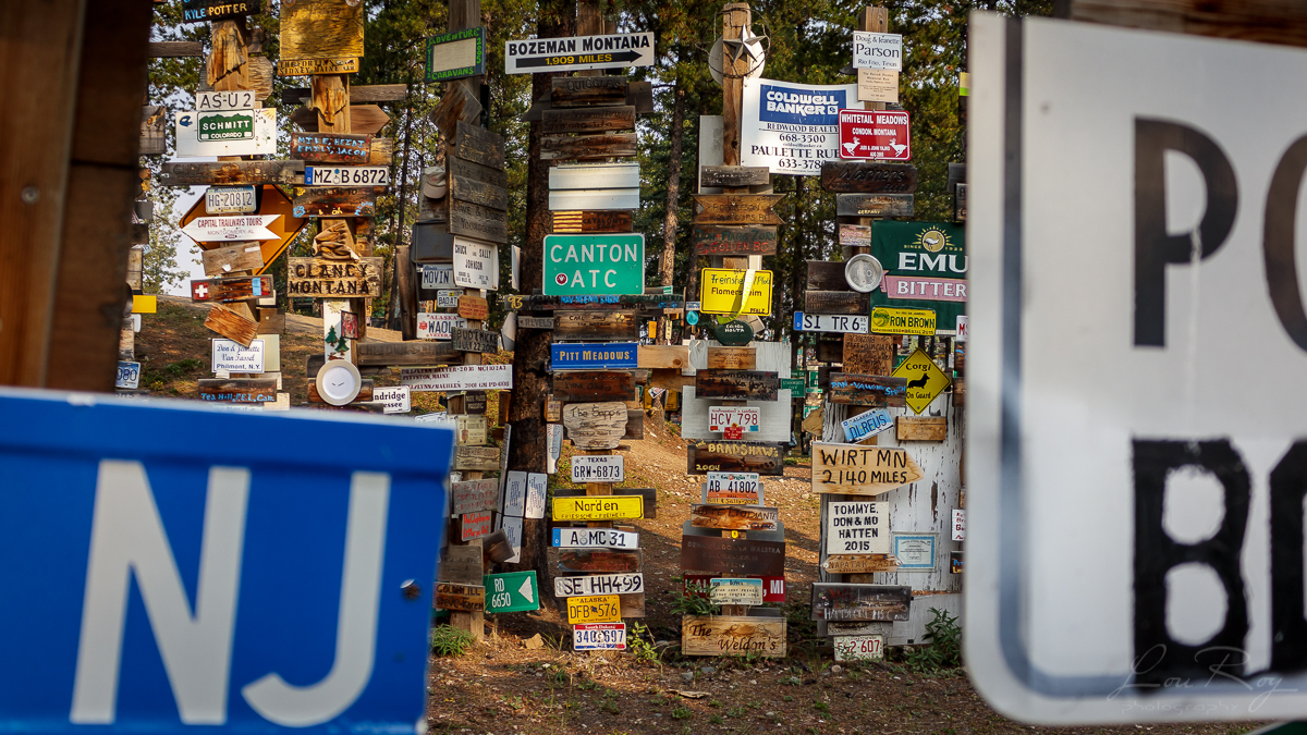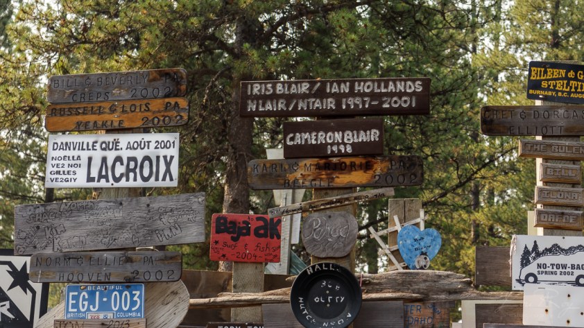 9:30 – J’arrive tôt à Watson Lake, Yukon, ville de 1 200 habitants située à 10 km de la frontière sud. La curiosité locale est un site de panneaux indicateurs, une forêt plutôt. Le premier aurait planté par un GI en 1942, à l’époque de la construction de la route.