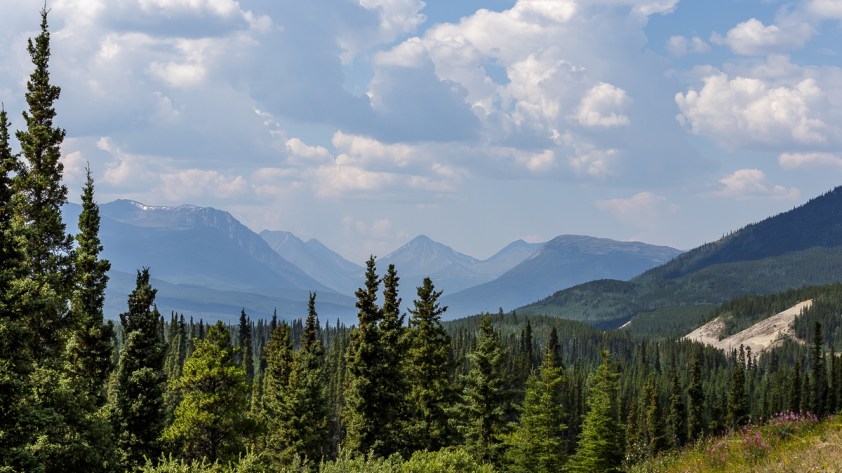 7:15 – Je repars vers le nord-ouest. La route est en excellente condition, mais la chaussée a un roulement très bruyant… pour mon ouïe très fine. Le service d’électricité n’est pas disponible entre Fort Nelson et Watson Lake. L’usage des génératrices pour faire fonctionner les pompes dans une station service justifie le prix de l’essence à 2$ le litre. Le camping que nous quittons à Liard River est alimenté par génératrices, deux gros monstres rugissant près de l’office (pauvres employés qui supportent ce bruit 24/24) que l’on entend – à moindre intensité, à la grandeur du camping.
