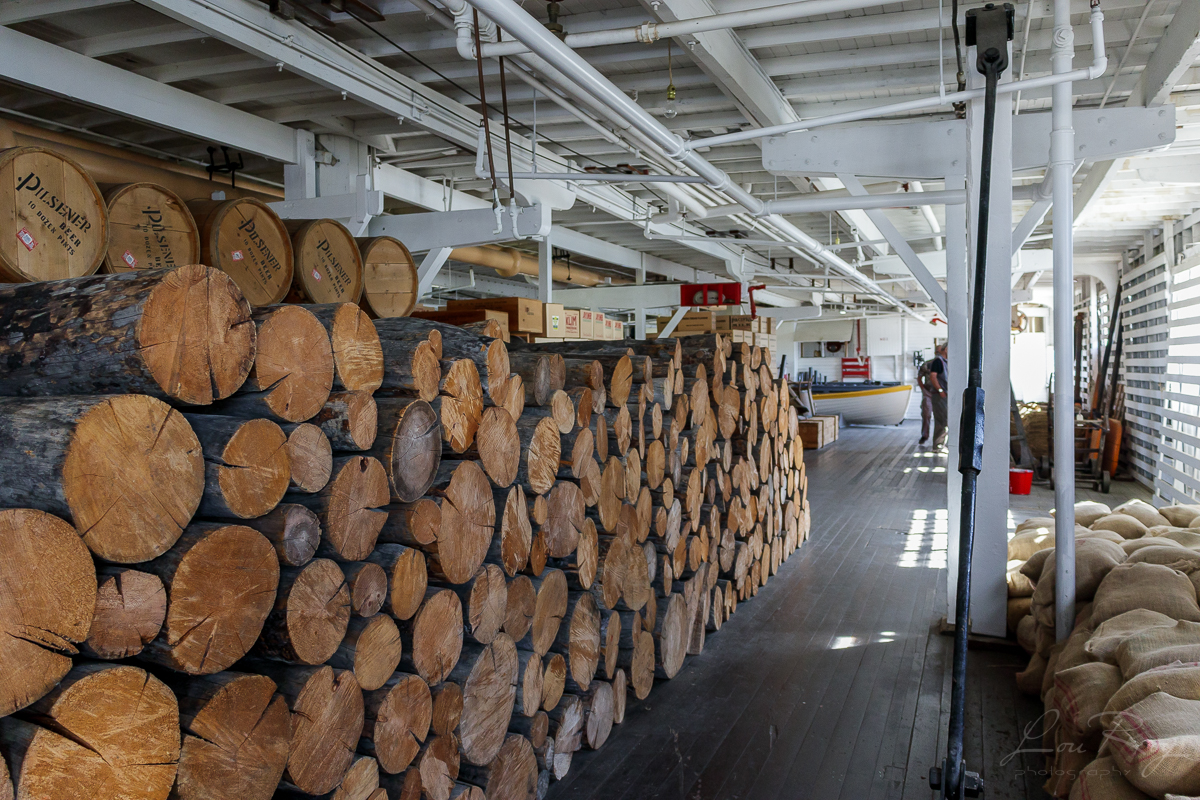 À l’avant se trouvent la chambre de combustion et la chaufferie où travaillait le chauffeur de la chaudière.  Il y faisait chaud et le travail était éreintant:  le Klondike brûlait, en moyenne, une corde (4 pi X 4 pi X 8 pi) de bois à l’heure.