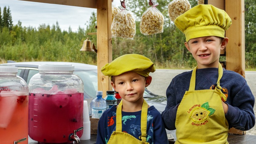 En route vers Denali, à Nenana: Deux jolis gamins qui tiennent un kiosque de jus et limonade. Ils vendent également du popcorn. Trop mignons! Mais je pense qu’ils étaient tous les deux ben tannés de faire prendre en photos!