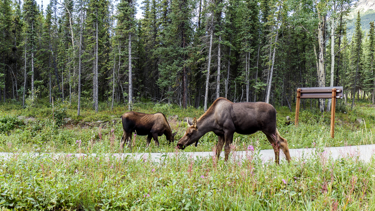 J’installe la Criquette, je lunche et après m’être fait une idée sur ce que je souhaite faire et voir pour les deux prochains jours, je me dirige au centre des visiteurs pour m’inscrire au « Natural History Tour » pour demain, d’une durée de 5 heures . En partant du centre, à l’intersection giratoire, il y a là la mère orignal et sa grande fille (en avant-plan, vraiment plus petite que la mère). En liberté!! Pas dans un zoo ou dans une réserve!!
