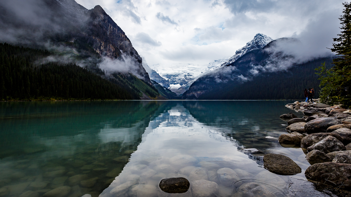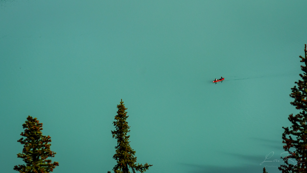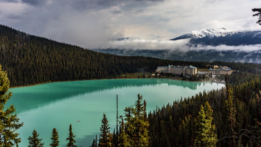 Première surprise!  Je ne savais pas qu’il y avait un méga gros hôtel sur le site du Lac Louise. On dirait que ça me dérange. Je poursuis sur le sentier pensant que les rives du lac seraient visibles au bout d’une certaine marche.  Mais non!  Je suis déjà là sur le bord du lac.  J’aurais pu m’y mettre les pieds. Il y a des passerelles longeant la rive, un kiosque de location de canots à 110$ pour 30 minutes.  Déjà pas mal d’animation même si tôt et le temps maussade.  J’ai le sentiment que l’on abuse.  De Louise. Du lac.