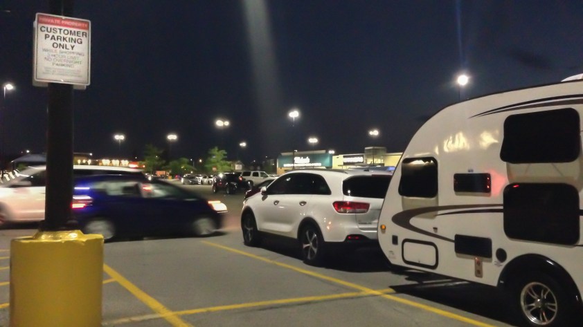 Jour 1 – 643 km – 21:45 – Nous sommes actuellement à Cambridge, Ontario – stationnés pour la nuit dans la cour d’un Walmart.  Mais là, je me demande bien si c’est autorisé ici… Selon une application de mon iPhone, ce serait permis, toutefois la pancarte dit: « Pour les clients seulement et pour une période maximale de 3 heures consécutives – et qu’au delà de cette période, le véhicule sera remorqué!  » Well… je suis le seul VR à cette heure-ci, ce qui n’augure pas bien.  Mais considérant que NOUS sommes très fatiguées – ayant affronté un violent orage en entrant en Ontario ET ayant travaillé presque 2 heures en début d’après-midi (pour payer ma taxe d’amusement ), on reste I-C-I-T-T-E pour toute la N-U-I-T-E c’est toute!!
