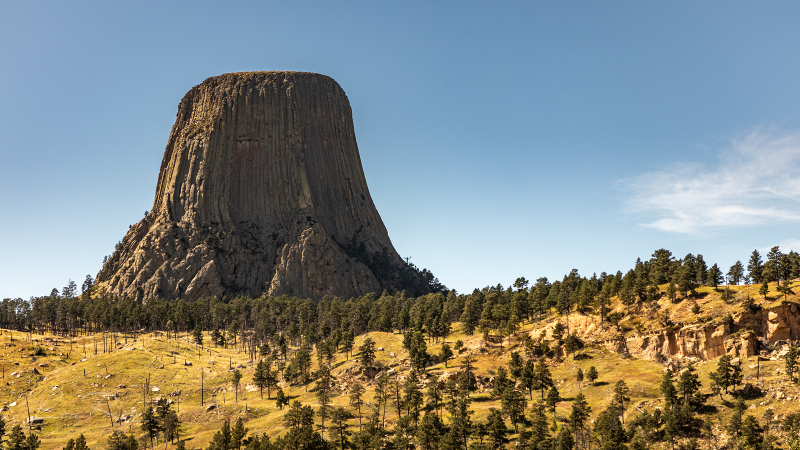 *Devils Tower National Monument – Lieu sacré des Amérindiens, a été classé monument national en 1906.  Ce monolithe cannelé se dresse sur 264 m; son sommet couvre 0,6 ha. Il vous semblera sans doute familier si vous avez vu – Rencontres du Troisième type de Steven Spielberg!  Butte striée aux parois verticales, Devils Tower est le noyau d’une intrusion de roche ignée, mis à nu par l’érosion des roches sédimentaires environnantes. La première ascension du sommet a eu lieu le 4 juillet 1893, devant plus de mille spectateurs.  Aujourd’hui, 5 000 varappeurs se mesurent chaque année à ses parois.* Extrait du Guide Vert.