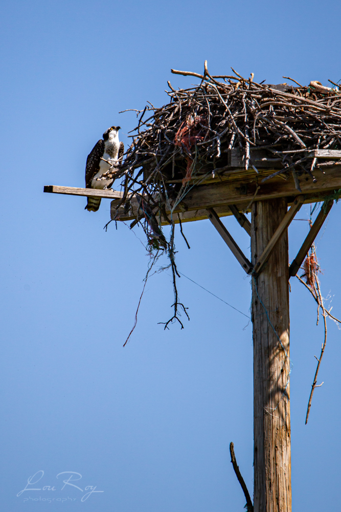 Un « facilitateur » a permis l’installation de cet énorme nid au-dessus d’un poteau électrique. Je demande l’aide de Gaetan pour nous dire de quelle espèce il s’agit… À mon oreille, ce moineau émettait un cri de bébé apeuré à chaque pas que je faisais dans sa direction! 🙂