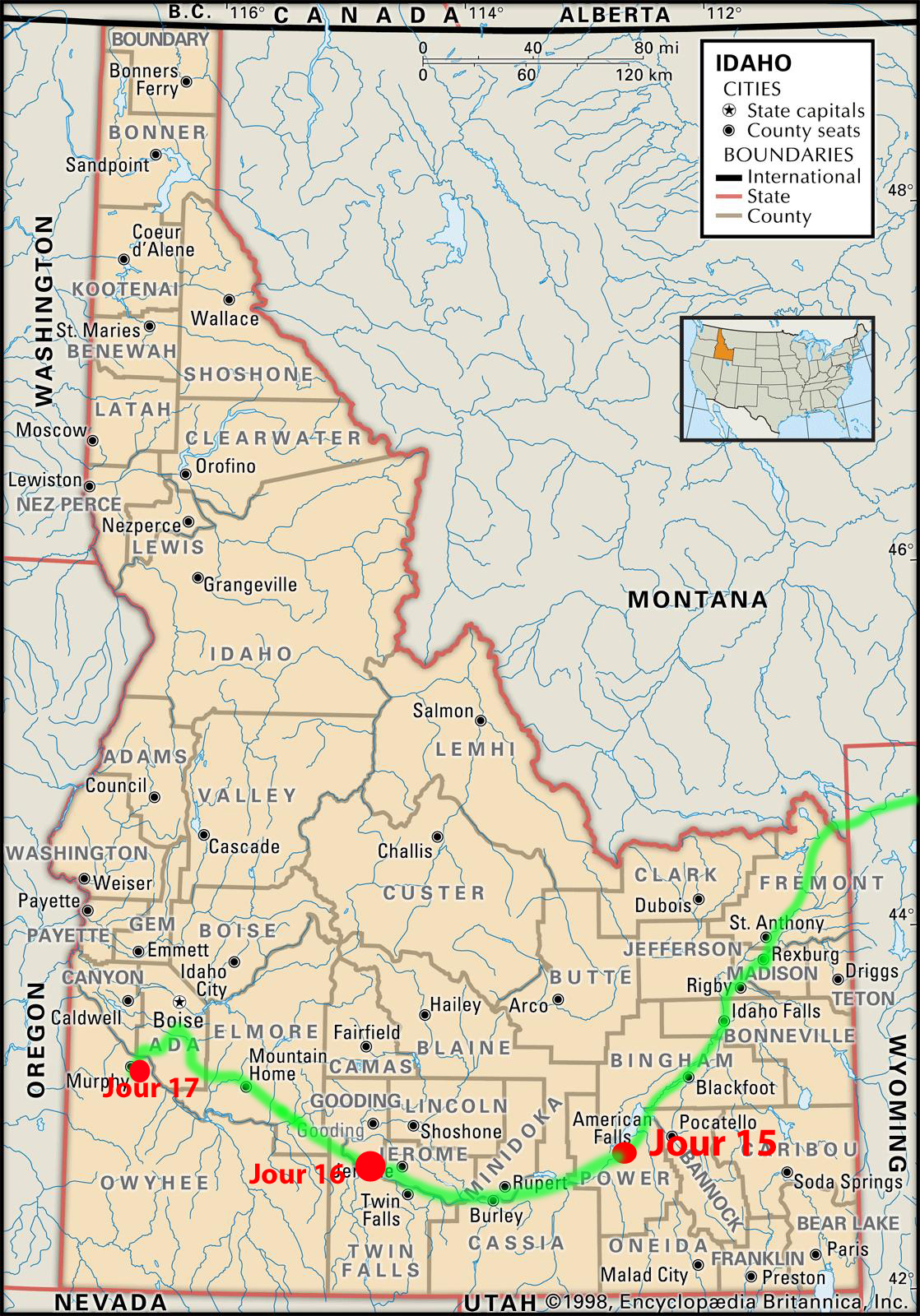 12:30 – En direction de Boisé, capitale de l’Idaho, le ciel est bleu foncé, menaçant et il vente très fort. Je m’arrête à une station de services pour luncher, laisser passer l’orage et… faire une sieste!! 🙂 Et bien, ça passé en vent seulement! Que quelques gouttes de pluie.