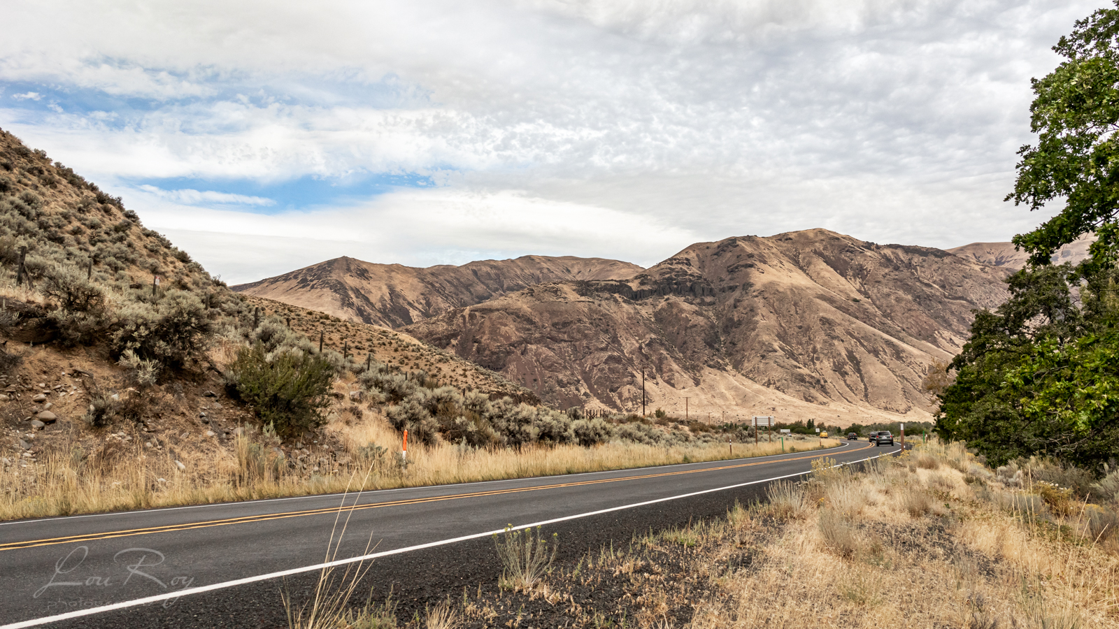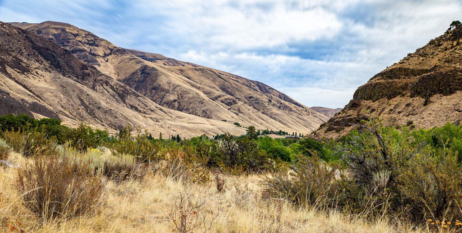 15:20 – Après être sortie du parc national, le paysage me rappelle le Wyoming. Désertique et d’une grande beauté! Je traverse un col de montagnes arides avant d’entrer dans la région des Monts Wenatchee. C’est très beau! À l’arrivée au point culminant d’un col, j’aperçois au bas une vallée à perte de vue avec des cultures verdoyantes et au loin une chaîne de montagnes. Je n’ai pas pu m’arrêter pour capturer la scène…
