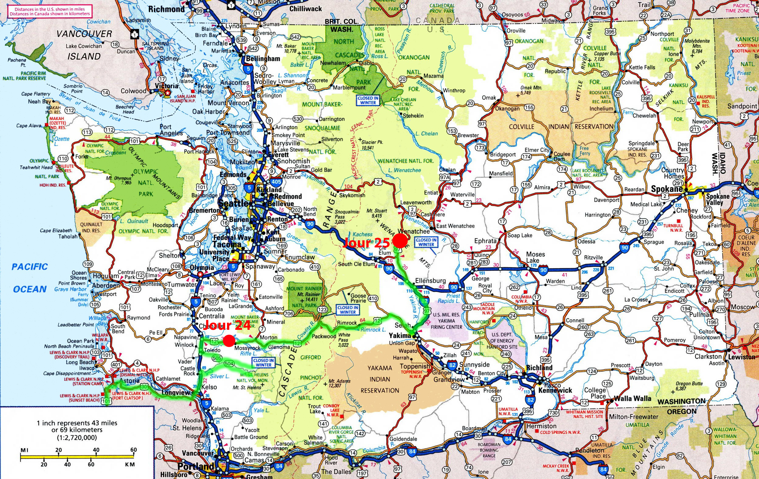 Jour 25 – Distance parcourue : 329 km – Total : 8 521 km – J’ai l’impression de ne pas avancer assez vite… Je regarde les traits rouges, bleus, verts, jaunes sur la carte routière depuis plusieurs semaines et ils me donnent toujours une fausse impression de routes faciles, sans intérêts ou sans reliefs. Je roule donc d’étonnements en étonnements, entre autres pour ici dans l’état de Washington. Et je n’ai aucun itinéraire, donc je ne sais pas si je passe trop de temps dans un endroit ou si je devrais y passer plus de temps. Pis je commence à trouver ça l’fun!