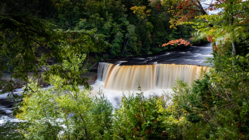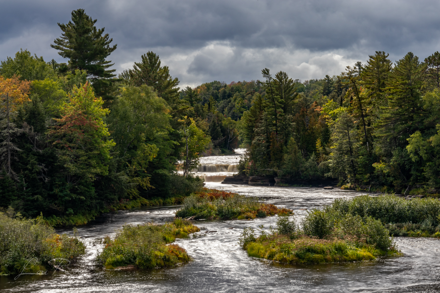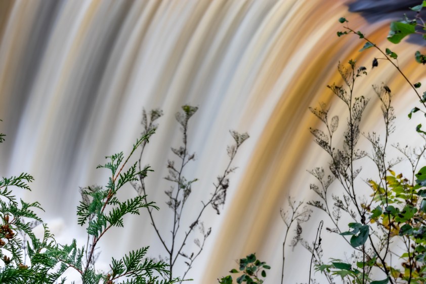 « Le parc national Tahquamenon Falls couvre près de 50 000 hectares et s’étend sur plus de 13 miles. La majeure partie du parc est non aménagée et la pièce maîtresse du parc est la rivière Tahquamenon et ses cascades. Upper Falls est l’une des plus grandes chutes d’eau à l’est du Mississippi (chute de près de 50 pieds, 200 pieds de largeur avec un débit maximal de 50 000 gallons d’eau par seconde). L’eau de couleur ambrée est causée par les tanins lessivés du cèdre, de l’épinette et de la pruche des marais drainés par la rivière. L’eau extrêmement douce agitée par les chutes provoque de grandes quantités de mousse, qui sont la marque de fabrique du Tahquamenon depuis l’époque du voyageur. » Extrait du Michigan Department of Natural Resources.