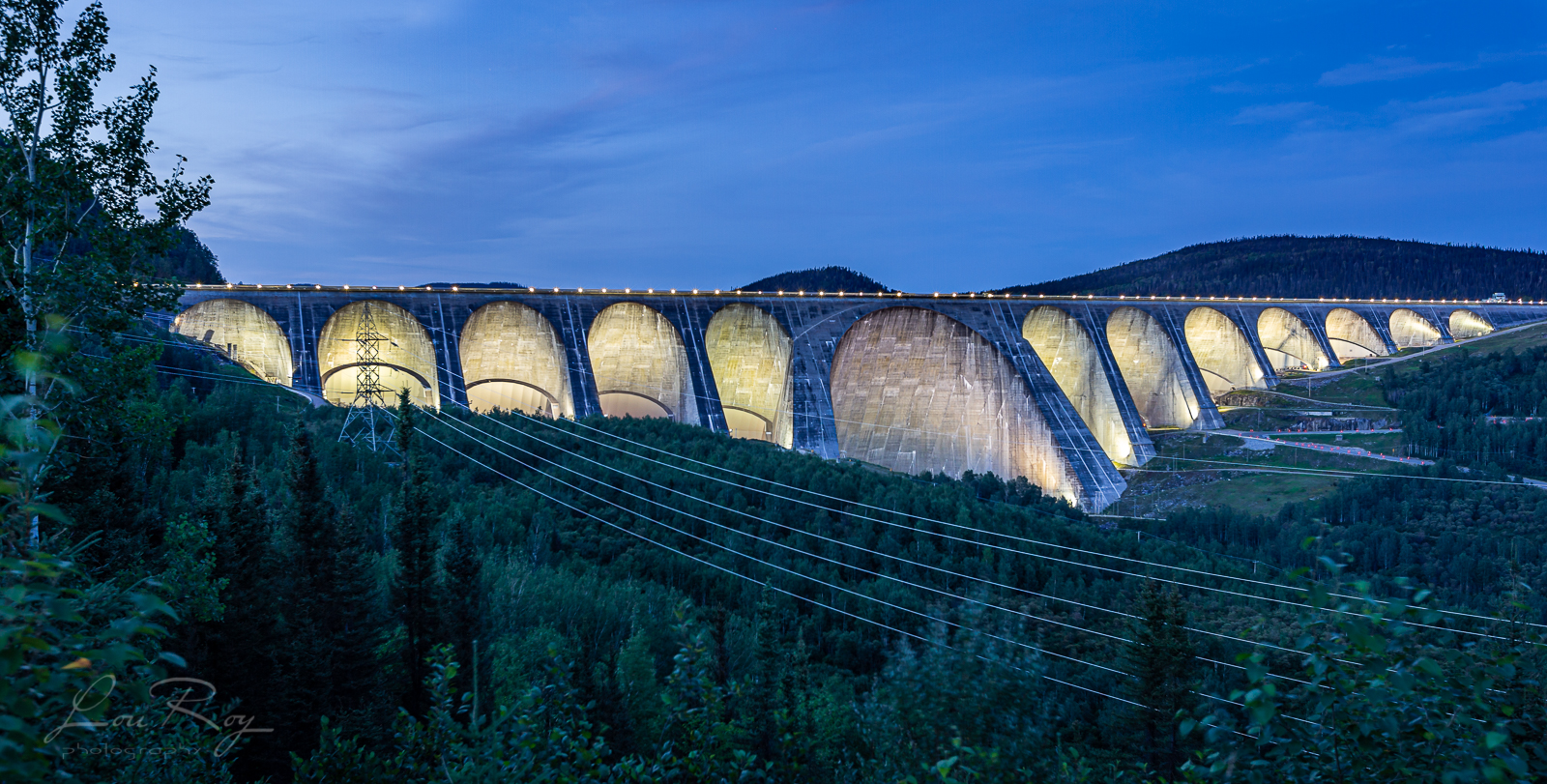 Patrick est photographe. Alors… ben, on parle « photographie »!:-) On se rejoint après le coucher du soleil pour photographier le barrage à – l’heure bleue. Magnifique!