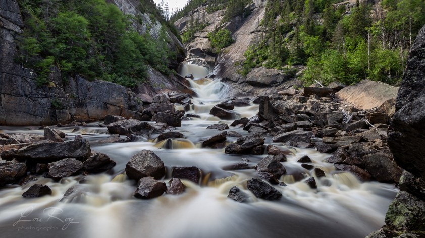 Je lunch rapidement pour ensuite me rendre à la chute McDonald.  Je dois emprunter une route de gravier sur 28 km pour atteindre le poste d’accueil de la SEPAQ et ensuite faire un autre 13 km (82 km aller-retour) pour atteindre le stationnement où démarre le court sentier permettant d’atteindre la chute.