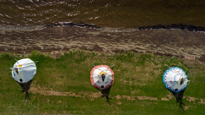 De la 132, ces tipis dans la réserve autochtone de Gesgapegiag attirent mon attention. J’entre sur le terrain. Je demande la permission de faire voler Ti-Gars à une dame micmac en train de brûler des herbes.