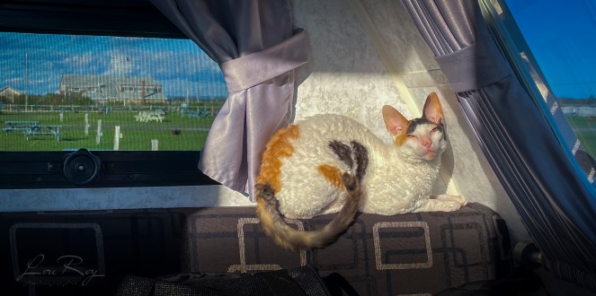 En moins de 10 minutes, Criquette est installée – libérée d’Henri, et Mado profite du chaud soleil de la baie. Toutefois les vents sont trop intenses pour qu’elle puisse marcher à la plage. Je dois tenir la porte de la roulotte à deux mains tant les vents sont violents!
