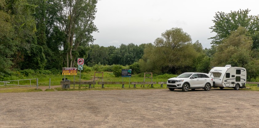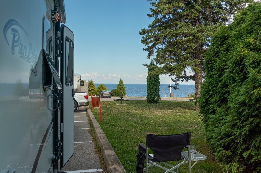 On s’installe à la Pointe Scott (ou plage Scott) où la ville de Roberval offre gratuitement une quarantaine d’espace pour les VR avec vue sur le lac. Il y a quelques accès pour se baigner, des toilettes, une station de vidange, de l’eau potable, bref tout ce qu’il faut pour satisfaire les familles. Pis c’est samedi, alors il y a du monde!! Pis il fait 32 degrés à l’ombre. Je pense bien rester ici pour deux nuits, surtout que je peux découpler Criquette et visiter aux alentours avec Henri.