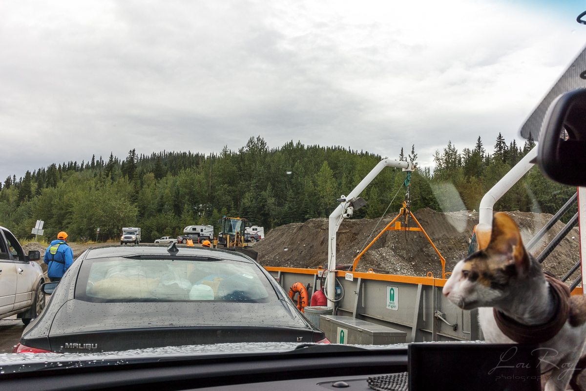 10:30 – Nous sommes sur le traversier à la sortie de Dawson City. Très court trajet – gratuit qui permet de traverser le fleuve Yukon et prendre de l’autre côté la « Top of the World Highway » vers l’Alaska. Pas de réservation, c’est premier arrivé, premier traversé! En hiver, pas de ferry, on roule sur la rivière gelée! Le courant est fort; le capitaine manoeuvre avec aisance et expérience pour nous mener sur l’autre rive en quelques minutes.