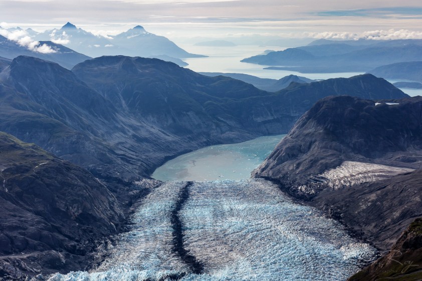 Ce matin je m’offre un rêve, celui de voler au-dessus des montagnes et glaciers pendant une heure trente minutes. Je n’ai pas pu le faire à Valdez en hélicoptère, à cause de la pluie et de la brume, alors je m’envoie en l’air à bord d’un Dehavilland Beaver, avion de construction canadienne (moteur de Pratt & Whitney) et modifiée pour les besoins en Alaska, méticuleusement entretenue par Paul son pilote de Mountain Flying Service.