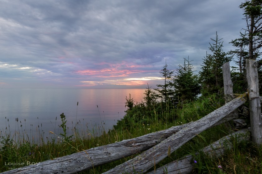 3h45 – Je roule vers la Pointe Carleton avec le fol espoir de capturer un lever de soleil intéressant. Quinze minutes plus tôt, je me suis levée sur la pointe des pieds pour ne pas réveiller tout le pavillon, mais je crains que le démarrage de « la Bête » ait interrompu quelques rêveries. La météo du jour est à la pluie et le bas du ciel offre peu d’ouverture au soleil naissant. Déjà à la pointe est au loin les nuages de pluie se disputent le territoire avec les rayons du jour.