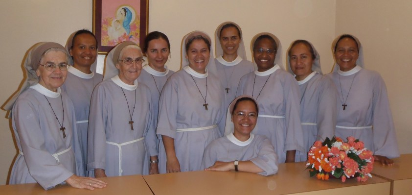 (Tante Hélène à l’extrême gauche, S. Agnès, S. Pascaline – à l’avant accroupie , S. Marie-Gabrielle, S. Gina, S. Marie-Claire, S. Marie-Thérèse, S. Marie-Angela, S. Pepiena, S. Pauline, S. Delphine, S. Martine – (Deux religieuses sont en retraite, S. Pauline et S. Delphine et – Mère Marie-Philippe, abbesse, est en déplacement aux Philippines)